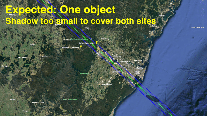 We assumed the asteroid was one object. In that case its shadow would not be big enough to fall on both observatory sites (the yellow pin markers). However, if the asteroid is really two smaller objects, it would explain why both sites saw the star disappear.